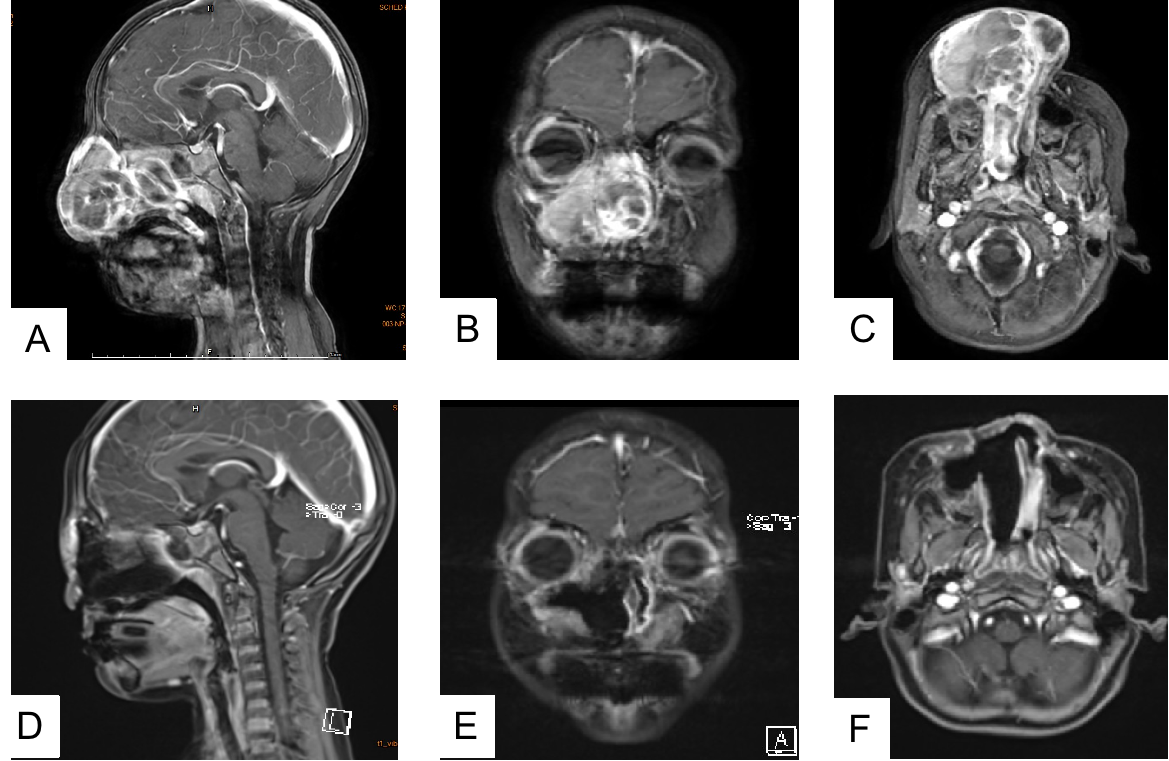 一年半前,雯雯因一次轻微鼻外伤后,鼻部出现了进行性增大的肿块,并伴有出血。起初被外院诊断为“创伤性血肿”,但常规治疗无效。随着肿块迅速长大并侵蚀周围骨质,病情急转直下。家人带着她踏上了漫漫求医路,先后咨询了上海、北京等地多位权威专家,接受了包括介入栓塞、药物注射乃至靶向治疗在内的多种方案。然而,肿瘤表现出惊人的顽固性,所有治疗均未能遏制其进展,肿瘤反复复发,并向面部扩展。一次次的希望与随后的失望,让这个家庭承受了巨大压力,诊疗也似乎走进了死胡同。